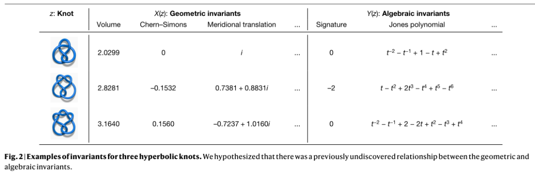 他们发现了纽结的代数和几何不变量之间惊人的关联,建立了数学中一个全新的定理。这些不变量有许多不同的推导方式,研究团队将目标主要聚焦在两大类:双曲不变量和代数不变量。两者来自完全不同的学科,增加了研究的挑战性和趣味性。图 2 给出了不变量的一些示例。