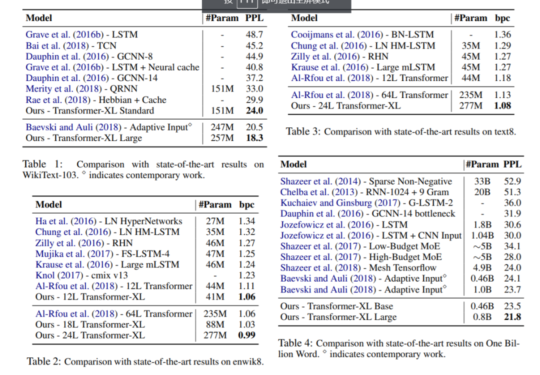 作者在语言模型任务上将Transformer-XL和其他state-of-art的模型进行对比,效果拔群。其中One Billion Word数据集中不包含长时文本的依赖,可以看到效果也是相当好的。