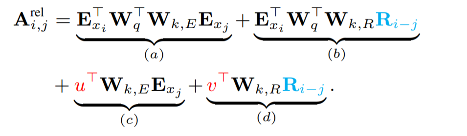运用相对位置编码的思想,我们首先会把(b)项和(d)项中的Uj替换成相对的位置编码Ri-j。这样的改变可以让原本与j的绝对位置有关的编码部分转为了只与两者之间的相对位置有关,这个相对位置编码和原来的绝对位置编码一样也是不可学习的,只与i-j有关。另外将原来在(c)项和(d)项中一样的Wk,变成了与Embedding对应的Wk,E 以及与位置编码对应的Wk,R。最后,作者引入了两个可学习的变量u和v,用以替代(c)项和(d)项中的绝对位置编码和query矩阵的乘积,因为在这里乘得的query相关向量应该与绝对位置无关。