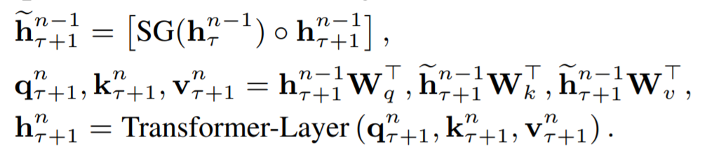 就像上面公式中描述的一样,第一个公式的о代表的是concat,SG代表stop gradient。首先将 τ时刻 n-1层的hidden_state 和 τ+1时刻n-1层的hidden_state拼接形成新的隐层向量。然后经过计算得到当前的q, k, v向量再通过Transformer的层来获得 τ+1时刻第 n 层的 hidden_state。可以看到它和标准Transformer的关键区别是,τ+1时刻的k和v向量是包含有 τ时刻 hidden_state的信息的。如此一来,两个片段之前的上下文信息可以进行有效的传递。