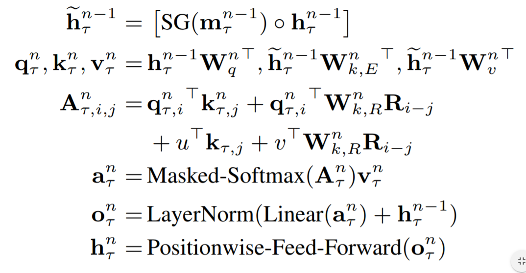 最后,结合循环机制和相对位置编码,Transformer-XL一层的完整公式如下所示: