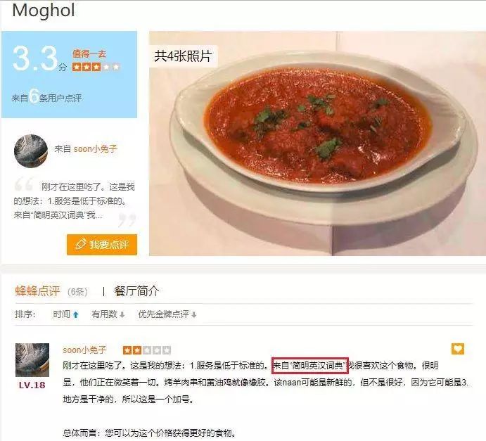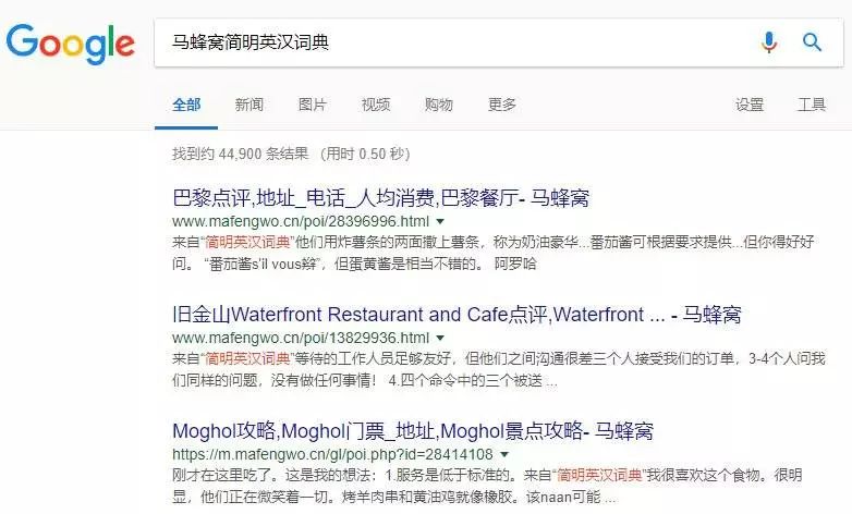 随后记者在谷歌搜索“马蜂窝简明英汉词典”,出现了三条带有“来自简明英汉词典”的马蜂窝点评。