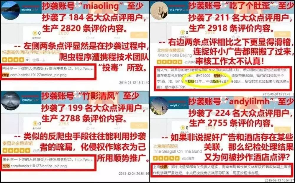 文章引用了一家名为乎睿数据团队的数据分析结果,声称马蜂窝的2100万条用户评论中有1800万条是从携程、美团等竞品网站抄袭而来。他们在马蜂窝发现了7454个抄袭账号,合计抄袭572万条餐饮点评、1221万条酒店点评,占到马蜂窝官网声称总点评数的85%。