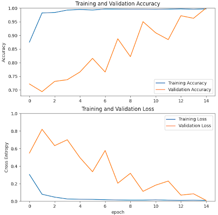 请注意,我们只运行了 15 个周期。在利用另一个数据集再训练时,很可能需要更多的周期。就“苹果”数据集而言,我们可以看到这个模型很快就达到了非常高的准确率:
