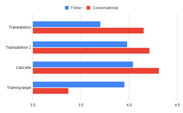 在我们衡量的各个方面,Translatotron 2 的表现都大大优于原始版本 Translatotron:更高的翻译质量(以 BLEU 衡量,数值越高越好),更好的语音自然度(以 MOS 衡量,数值越高越好),以及更强的语音稳健性(以 UDR 衡量,数值越低越好)。它在难度更大的 Fisher 语料库上表现尤为出色。Translatotron 2 在翻译质量和语音质量方面的表现接近强大的基准级联系统,并且在语音稳健性方面优于级联基准。