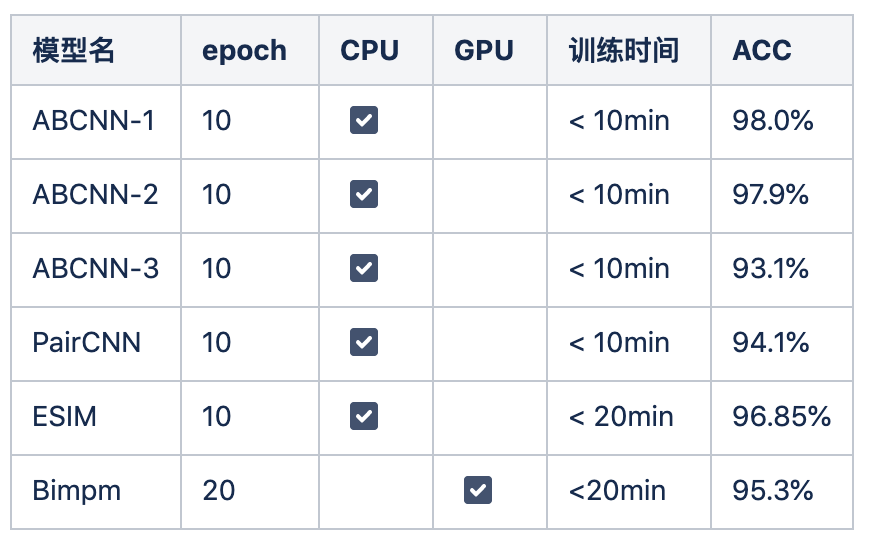 A: Bimpm模型结构相对复杂,从训练时间上和内存使用率上来说,bimpm应该是放在有GPU情况下考虑选择的模型,并且用原文的参数进行训练时会遇到显存用尽的报错,上表中的结果是删掉两层全连接层,并且减少了神经元个数后训练得出的。