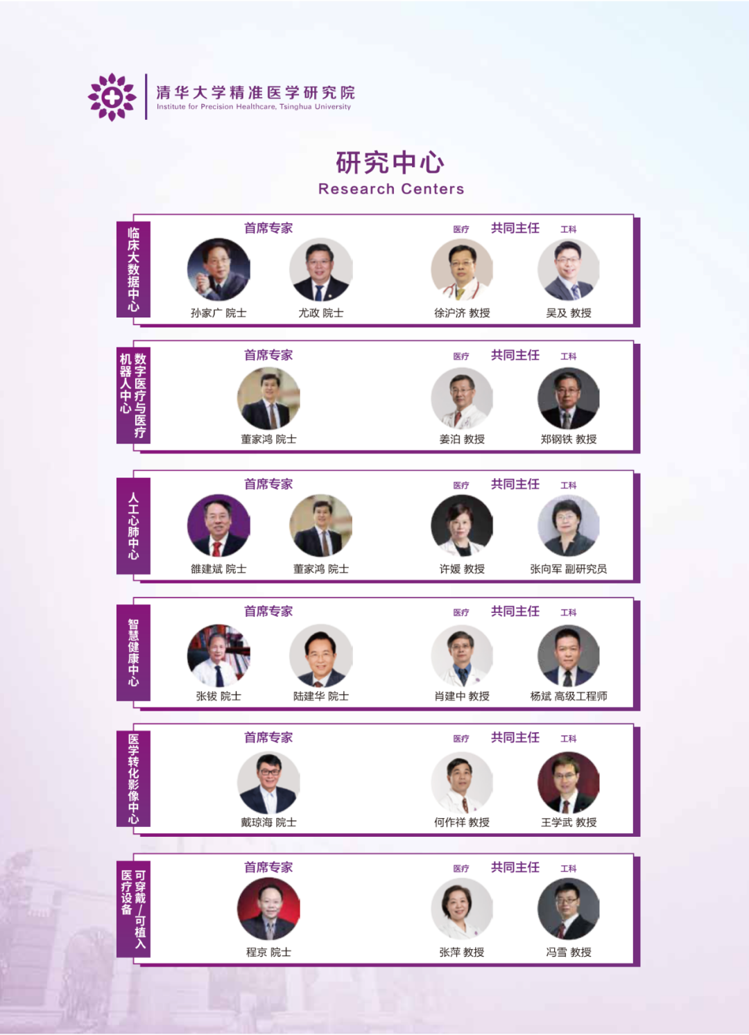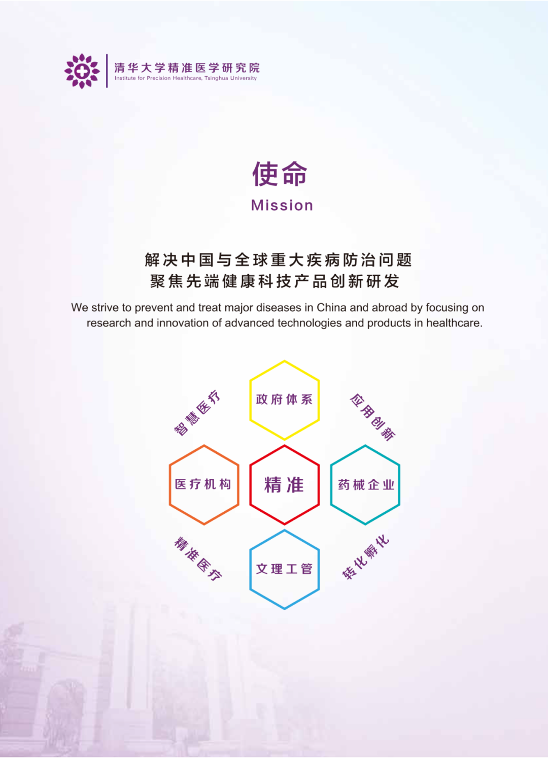 清华大学精准医学研究院成立于2016年1月,是清华大学临床医学与理工学科的交叉融合创新平台。研究院以服务健康中国和全球健康为使命,立足重大疾病防治需求和现代科学技术前沿,致力于健康医疗的核心技术和先进产品研发。研究院以精准医疗范式为引领,以临床和市场需求为双引擎,采用临床问题驱动型研究(Clinic-Driven Research,CDR)模式和健康产品导向型研发(Bedside to Bench to Customer,BBC) 模式,充分发挥清华大学临床医学资源优势和多学科融合创新优势,促进现代科学技术的临床转化应用和健康产品研发,打造医研企一体化的创新联盟和生态体系,推进健康医疗服务体系的重塑与健康医疗产业的发展。与此同时,重点构建复合型医工结合创新人才培养的平台和模式,培养适应社会经济发展与健康医疗产业兴起的医学创新领军人才,为推进人类健康医学事业做出应有贡献。
