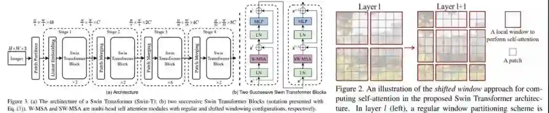 Swin Transformer 架构图(左),移动窗口示意图(右)。