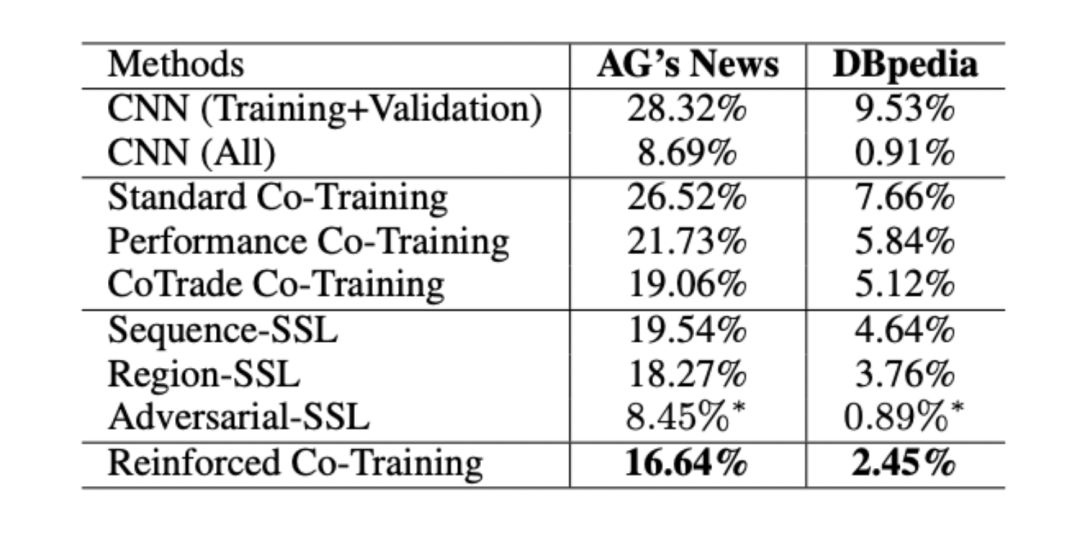 本文提出了一种新的方法——强化Co-Training,来选择高质量的未标记样本,以便更好地进行Co-Training。更具体地说,该方法使用Q-learning学习一个带有小标记数据集的数据选择策略,然后利用这个策略自动训练联合训练分类器。