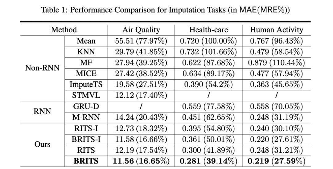 本文提出了一种新的基于递归神经网络的时间序列数据缺失值估计方法,BRITS算法。该方法直接学习双向递归动力系统的缺失值,没有任何具体的假设。将赋值作为RNN图的变量,在反向传播过程中可以有效地进行更新。
