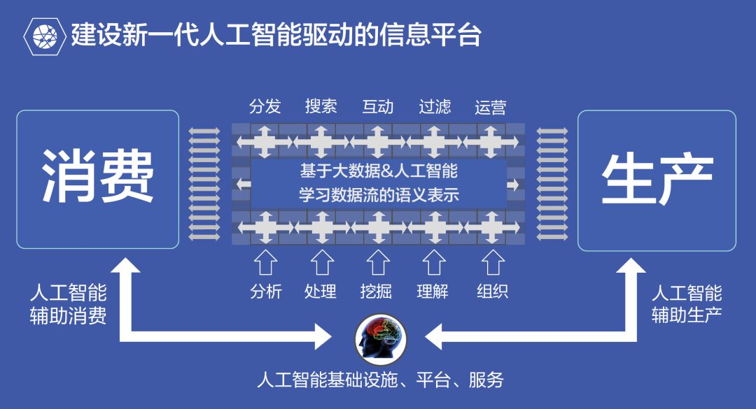 人工智能基础设施、平台与服务,基于大数据、人工智能学习数据流的语义表示,对信息进行分析、处理、挖掘、理解和组织,使得内容能够在分发、搜索、互动、过滤和运营方面变得更加智能,做到人工智能辅助消费与生产。
