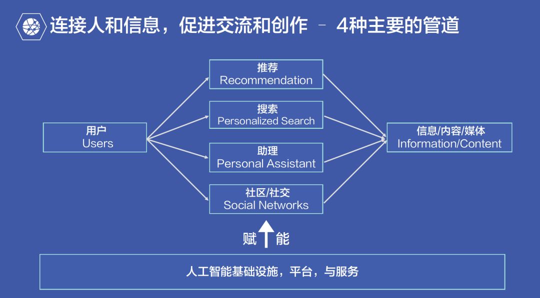 连接人跟信息是一个人类社会的基础设施。在这个设施的运作过程中,能够利用大数据、丰富应用的场景、大量的活跃用户,去不断完善和迭代,进一步赋能。而技术的进步最终是服务于人类的。