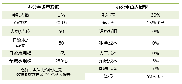 办公室场景的流量是 1 亿人/日,日流水 1 亿元,年流水 250 亿元,净利润率是 0-13%。可以说这是一个非常漂亮的模型,相比于 Amazon Go,有天壤之别。