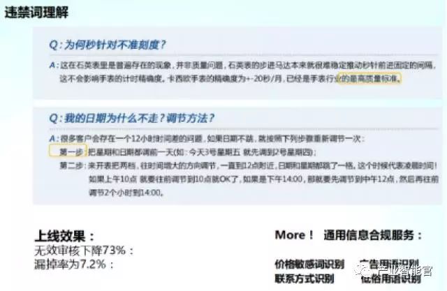 很多信息如果输入不正确,就会违反广告法或者价格法。上图中的“最高质量标准”是违反广告法的,下面的“第一步”没有违反,但”销量第一“的用词是违反的。从这个案例中我们意识到,仅仅依靠关键词是不够的,还需要借助上下文的关系。于是,我们就做了上下文的文本分类,无效审核下降73%,漏掉率为7.2%。