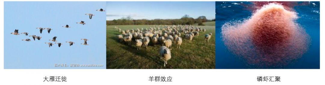 二是自下而上自组织的群智涌现,群体可以涌现出个体不具有的新属性,而这种新属性正是个体之间综合作用的结果。在科学理论中,1+1大于2,或者1xN>N的情况非常普遍。自然界中微观个体之间相互作用,往往不是简单线性关系的叠加,而是复杂非线性动态过程的迭代,从而使自然界呈现出复杂系统所展现出的不可推导性和不可预测性。“涌现”已被认为是与演绎、归纳相提并论的第三种智能产生范式。因此,对于群智现象,我们既要从宏观生物表现出的群智水平加以分析,又要从微观个体中对群智涌现的机理追根溯源。例如,科学家受到蚁群觅食、蚁群搬家群等这类群智行为的启发,创建了ACO(Ant colony optimization)即蚁群优化算法,该算法现被广泛应用到经济、社会等各个方面。此外,蜂群、鸟群、磷虾群等,都可以通过遵循简单的行为规则,涌现出宏观上复杂的智能行为,如大雁迁徙、羊群效应、磷虾汇聚等,通过分析这些群智行为的机理所产生的理论,广泛应用于经济、社会等学科。