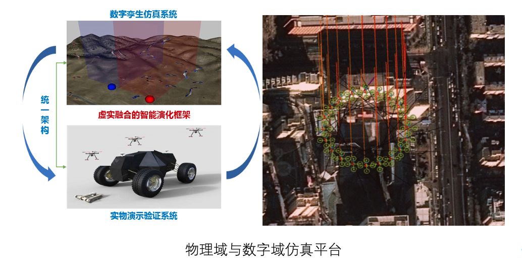 针对上述问题,飞行器智能技术团队以研发可自主进化的群体智能系统为目标,系统开展集群行为要素与群智激发汇聚机理建模、知识和数据协同驱动的群体智能实时推理与决策、自主协同控制与稳定性机理等方面研究,融合规则知识、已有算法和模型等知识驱动方法以及深度强化学习、演化计算等数据驱动方法,实现群体的智能自主进化。此外,在应用层面,该团队还开发了虚实融合的集群验证系统,包括数字域的仿真系统和物理域的无人机、无人车集群验证系统,以及构成底层支撑的自动驾驶仪、控制软件等核心软硬件模块,并针对典型任务和部分实际场景开展了应用验证。