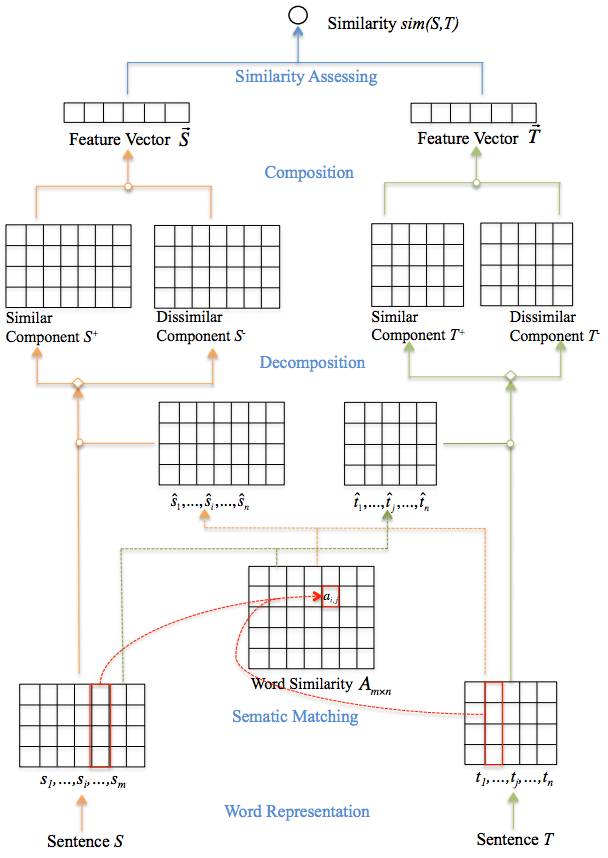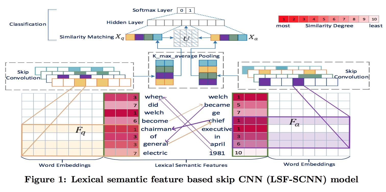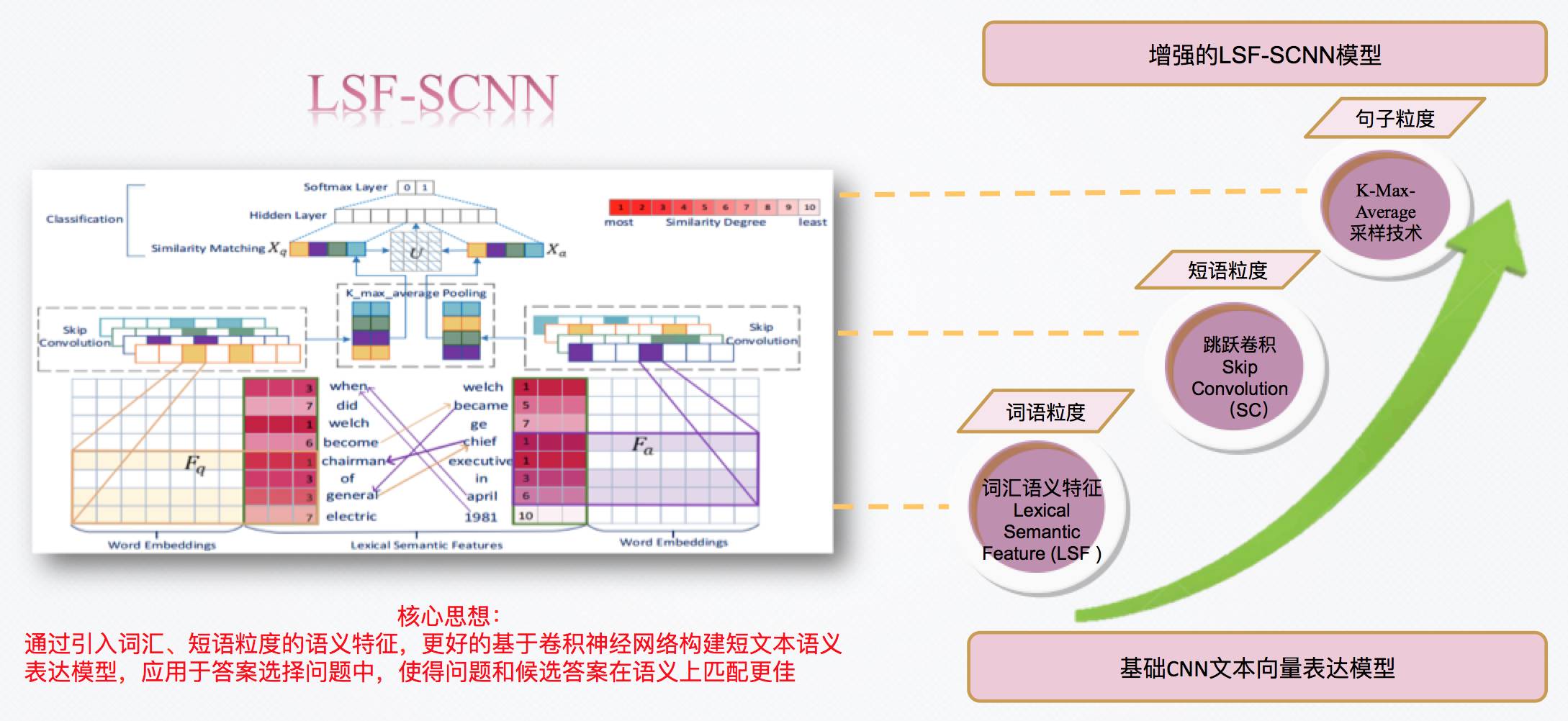 LSF-SCNN,即基于词汇语义特征的跳跃卷积模型 (Lexical Semantic Feature based Skip Convolution neural network ),基于卷积神经网络模型引入三种优化策略:词汇语义特征 (Lexical Semantic Feature, LSF)、跳跃卷积 (Skip Convolution, SC)和K-Max均值采样 (K-Max Average Pooling, KMA) ,分别在词汇粒度、短语粒度、句子粒度上抽取更加丰富的语义特征,从而更好的在向量空间构建短文本语义表达模型,并广泛的适用于问答系统 (question answering)、释义识别 (paraphrase identification) 和文本蕴含 (textual entailment)等计算成对儿出现的短文本的相似度的任务中。