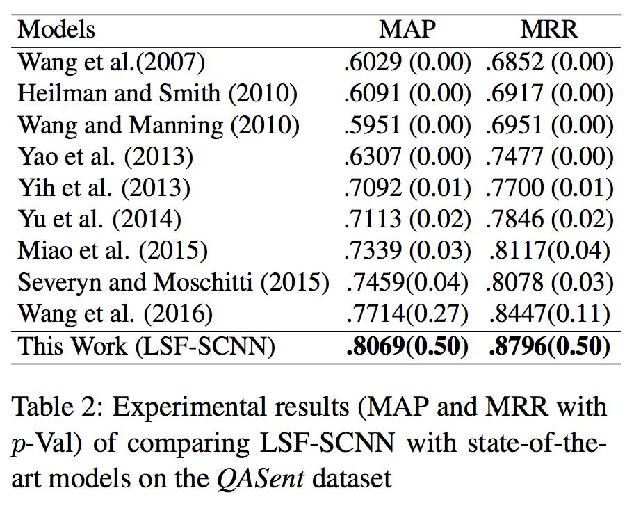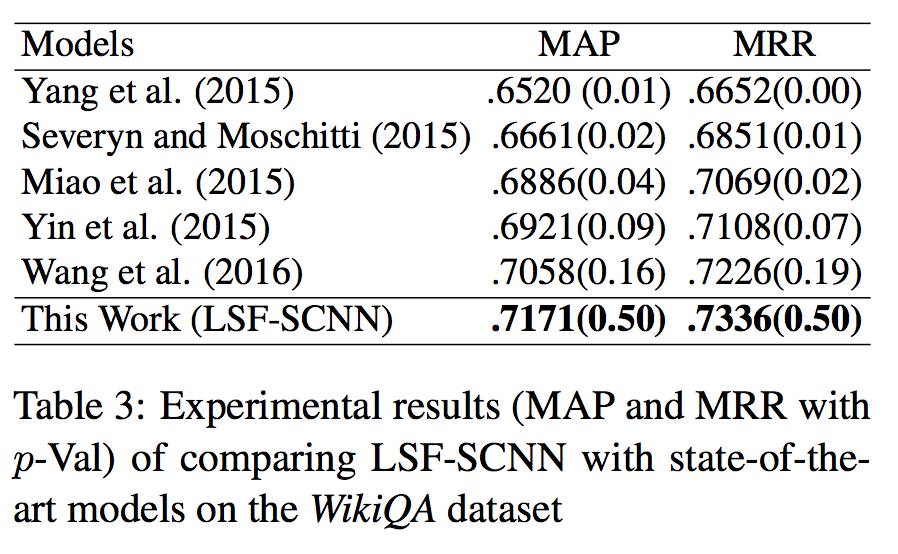 QASent候选答案要求至少与问题有一个非停用单词,而WikiQA中20.3%的答案与问题不存在相同单词,因此WikiQA对LSF技术提出了更高的挑战。
