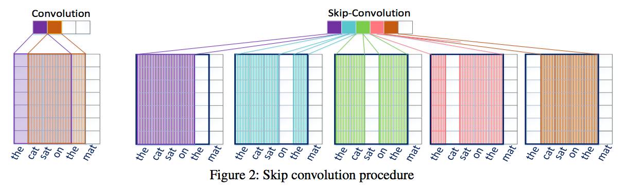 如上图所示,左侧传统卷积方式将卷积窗口作为一个整体,自左向右每次移动一个单词的步长进行卷积操作。相比而言,跳跃卷积则是同样自左向右每次移动一个单词的步长,但移动的并非卷积窗口的整体,而是整体中的一列。例如,上图右侧,初始卷积抽取了短语“the cat sat on”(紫色框)的特征;而后将覆盖在“on”上的卷积窗口的那一列向右移动一个单词的步长,从而得到短语“the cat sat the”(蓝色框)的特征;接着,将覆盖在“sat”上的一列向右移动一个单词的步长,从而得到短语“the cat on the”(绿色框)的特征,以此类推。