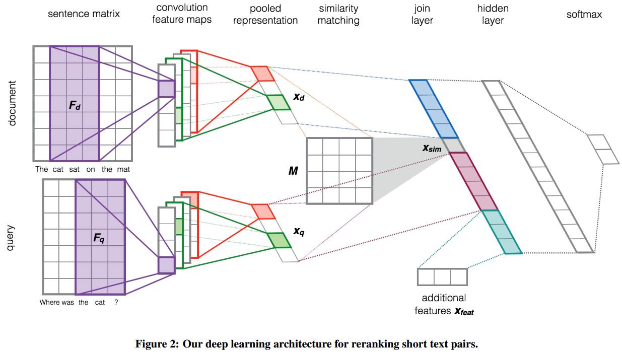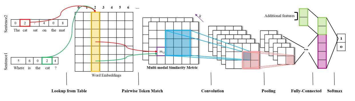 如下图,Meng在其文章中[7]直接基于词向量计算输入文本对儿在单词粒度上的相似度(计算方式有多种:欧式距离、余弦距离、参数化的相似矩阵),并以此为后续深层卷积神经网络的输入,最终学习得到的向量经过全连接层和softmax层进行预测。