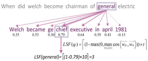 问题和答案中的每一个单词都会有一个LSF特征,具体来说是一个[0,t]上的整数值。LSF的计算过程可通过下面一个例子说明,当我们想要求解问题中general一词的LSF特征时,第一步我们需要计算general与答案中每一个词的余弦相似度并选取其中的最大值,因此chief被选取出来。第二步,余弦相似度值的最大值0.79将通过一个映射函数映射为一个[0,t]区间的整数,当我们假定t=10,最终计算得到general的LSF特征为3。这是合理的,general和chief一定程度上是近义词。