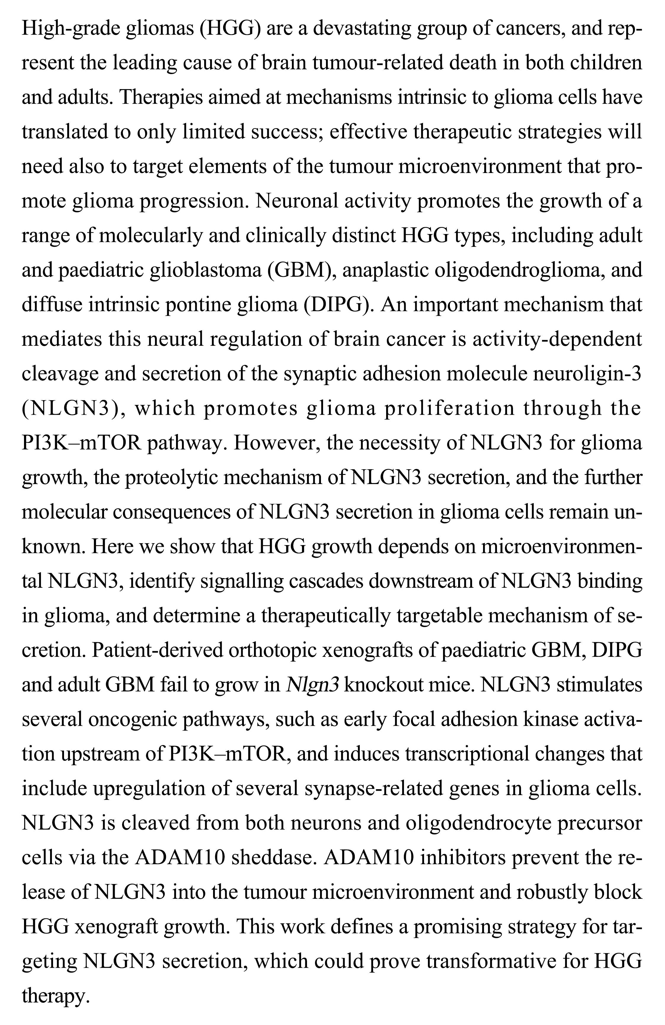 Targeting neuronal activity-regulated neuroligin-3 dependency in high-grade glioma