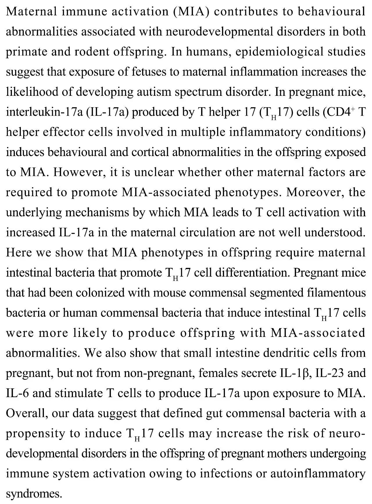 (导读 郭思瑶)母体免疫激活(MIA)可诱发子代神经发育紊乱导致的行为异常。科研人员发现 MIA 表型需要母体肠道细菌的参与来促进辅助性 T 细胞 17(TH17)分化。被移植了可诱导 TH17 的肠道菌群的怀孕小鼠更易产生 MIA 相关的异常子代。该发现表明肠道共生细菌具有诱发 TH17 的性质,可能会增加子代神经发育异常的风险。