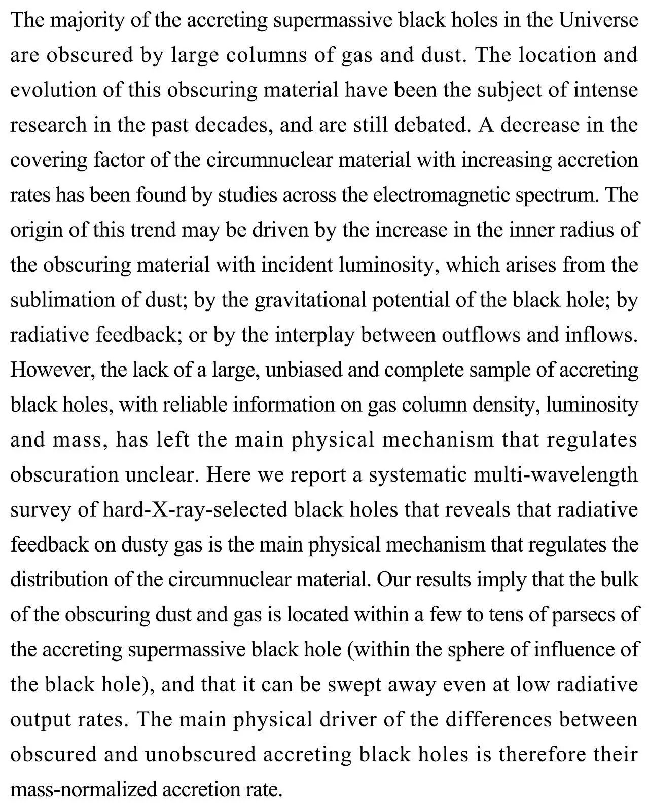 (导读 刘晓娟)宇宙中大部分超大质量黑洞都被大量气体和尘埃所掩盖。研究发现随着黑洞吸积率的增加,掩盖程度会下降,但其中的物理机制难以确定。本研究对硬 X 射线选黑洞进行系统的多波段测量,结果表明尘埃气体的辐射反馈是调节黑洞周围物质分布的主要物理机制。这意味着绝大部分尘埃和气体聚集在黑洞附近,因此,模糊和非模糊黑洞间的差异的主要源于质量标准化的黑洞吸积率。