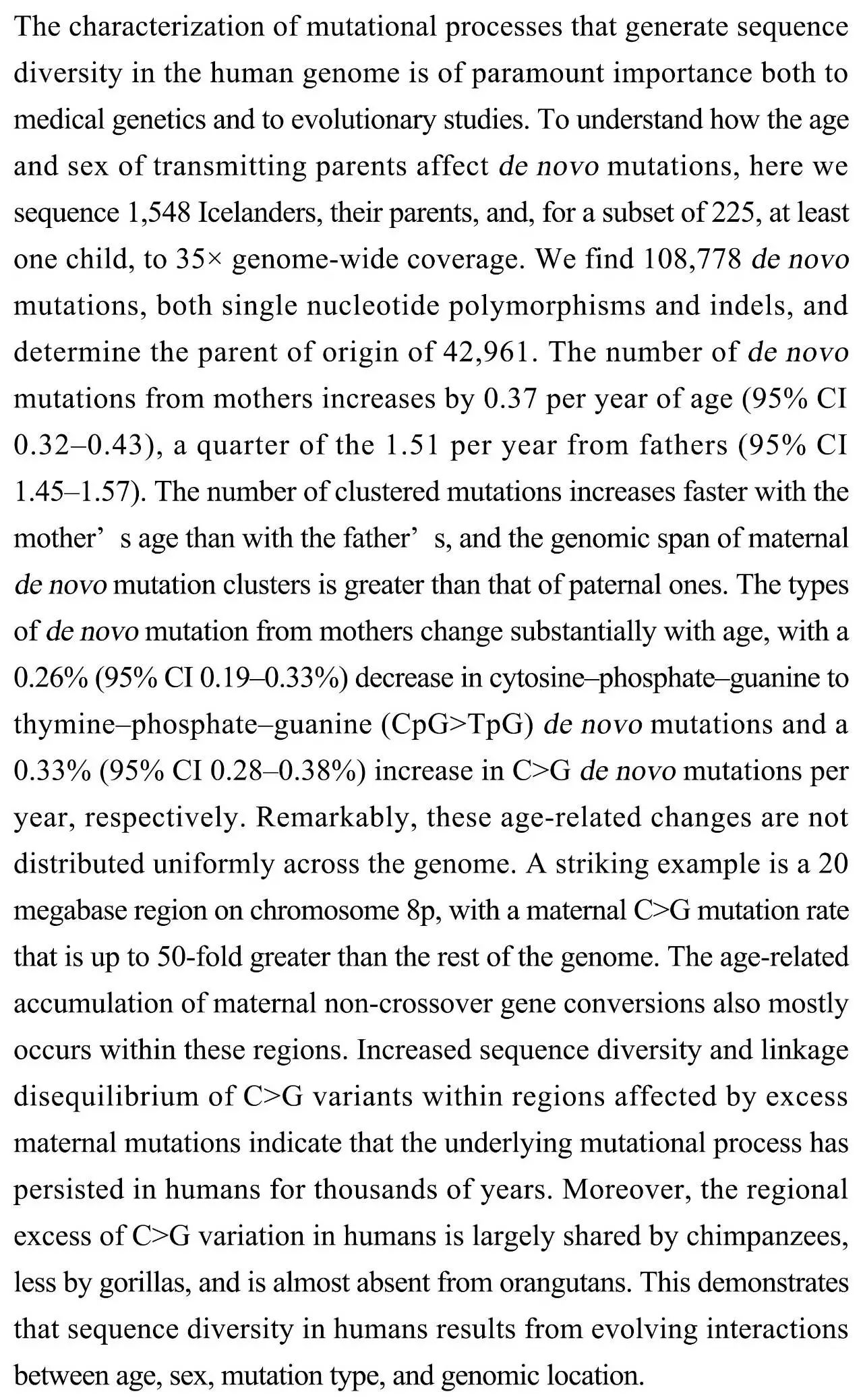 (导读 阿金)人类基因突变过程中产生的差异是遗传医学和演化研究的重点对象。本研究团队对冰岛人开展了全基因组序列分析,在 1548 名个体中鉴定出了高质量自发性遗传突变(DNM)并对确定父母来源的突变进行了分析,发现父亲年龄越大,子女的 DNM 发生频率越高,而簇状突变数量增长则更多来自母亲年龄增长的影响。突变的类型也与父母年龄相关。该研究对父母年龄和性别因素在基因突变中的作用有了新的认识。