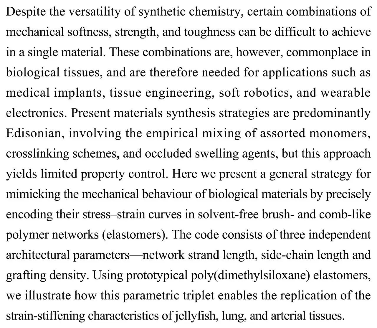 (导读 张奕林)在某种人造材料中模仿生物组织,同时保证材料的柔性、弹性与强度符合要求一直是合成化学的难题。本研究介绍了一种指导合成模拟生物材料机械性能的普适方法,该方法精确地将材料的应力-应变曲线体现在无溶剂的刷状或梳状聚合物网络(人造橡胶)中。研究人员利用原型聚(二甲基硅氧烷)人造橡胶,重现了诸如水母、肺部和动脉组织中的应变硬化特性。