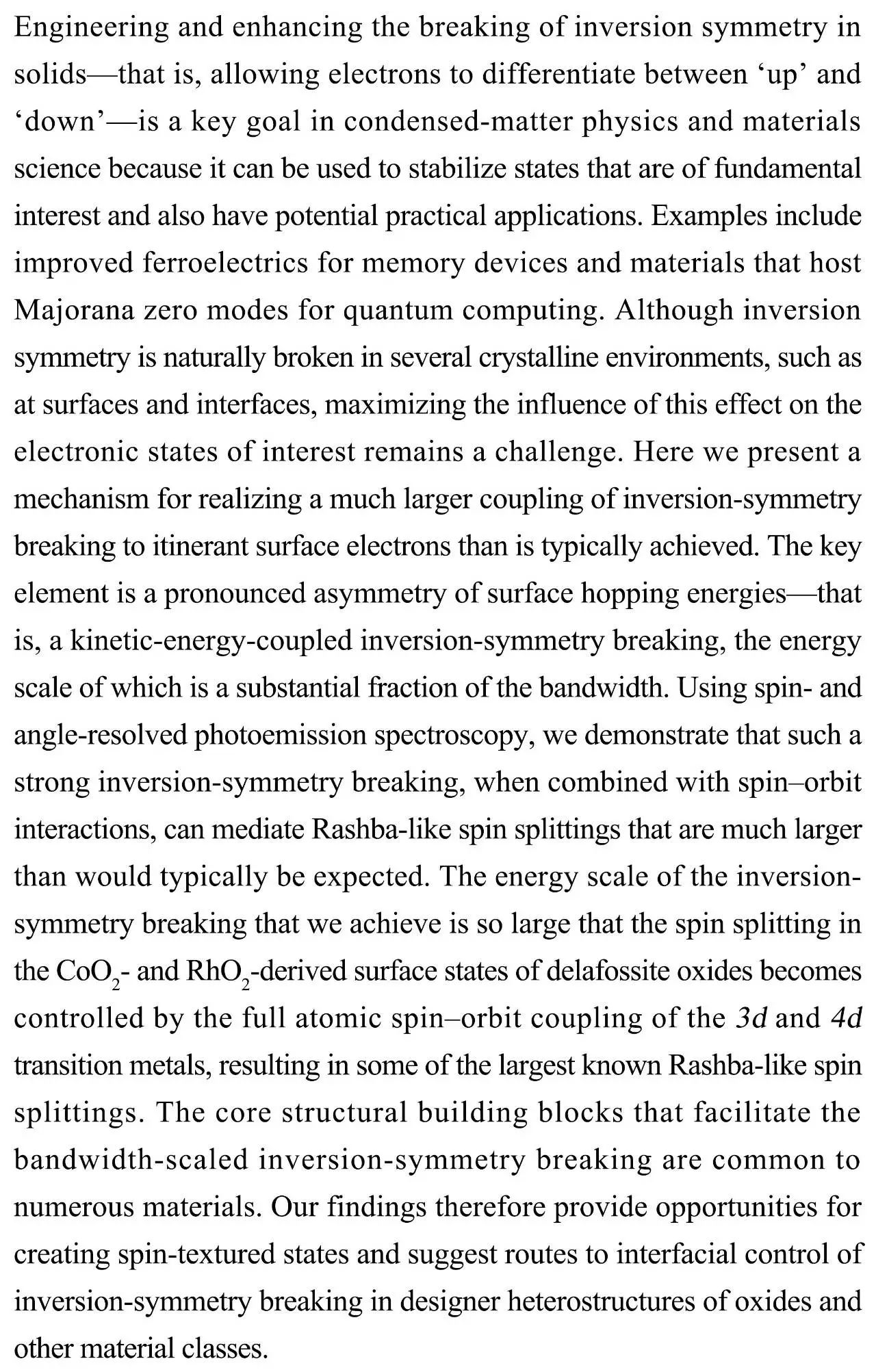 (导读 张奕林)调制和加强固体的反演对称破缺——即让电子分出“上”和“下”——是凝聚态物理和材料科学中的重要目标。本研究展示了实现反演对称性破缺与巡游电子超大耦合的机制,其关键在于动能耦合反演对称性破缺。研究人员借助自旋角分辨光电子发射谱,阐述了这一强反演对称性破缺与自选轨道耦合相结合,可极大地介导类 Rashba 自旋劈裂。这为在氧化物和其他材料中构建自旋结构态提供了可能性,并揭示了在设计异质结时调控界面反演对称性破缺的途径。