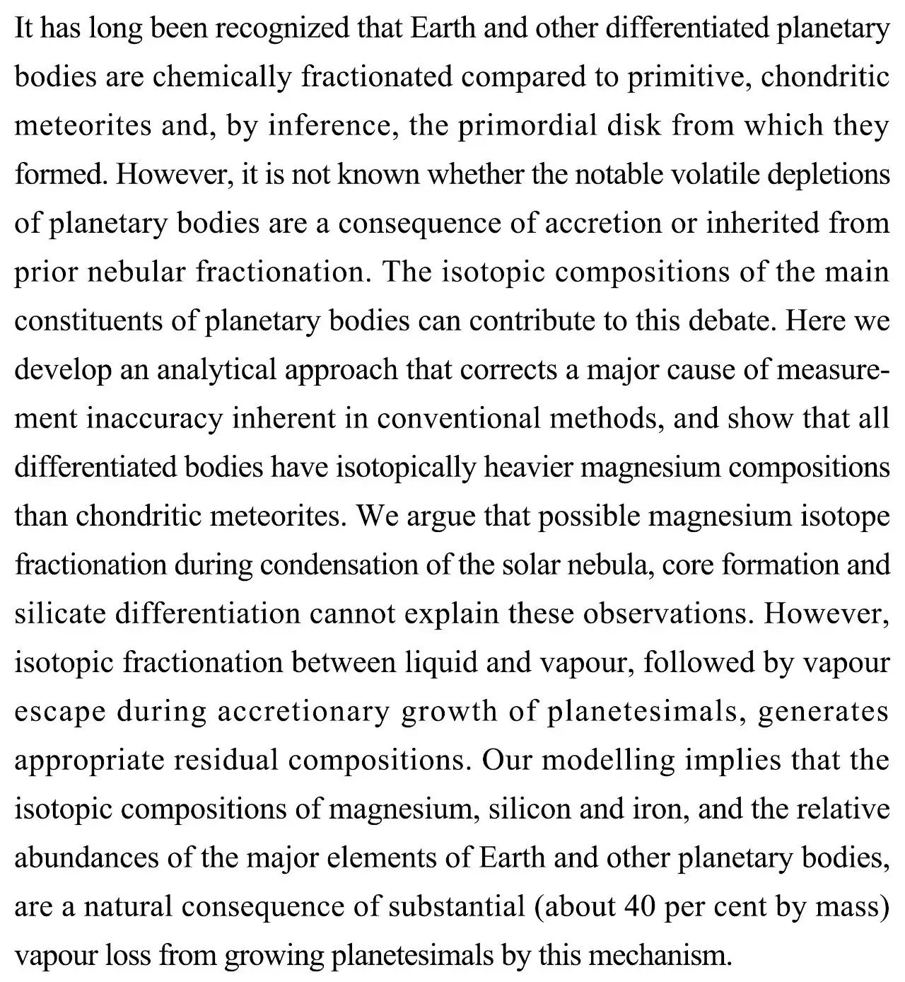 (导读 刘晓娟)地球和其他的行星体均存在化学分馏,但目前对行星体的挥发性消耗机制还不清楚。本研究提出了一种解决测量误差的方法,结果表明行星体具有比粒状陨石更重的镁同位素。镁、硅和铁的同位素组成以及地球和其他行星体的主要元素的相对丰度很可能是星球成长过程中大量蒸汽损失的自然结果。