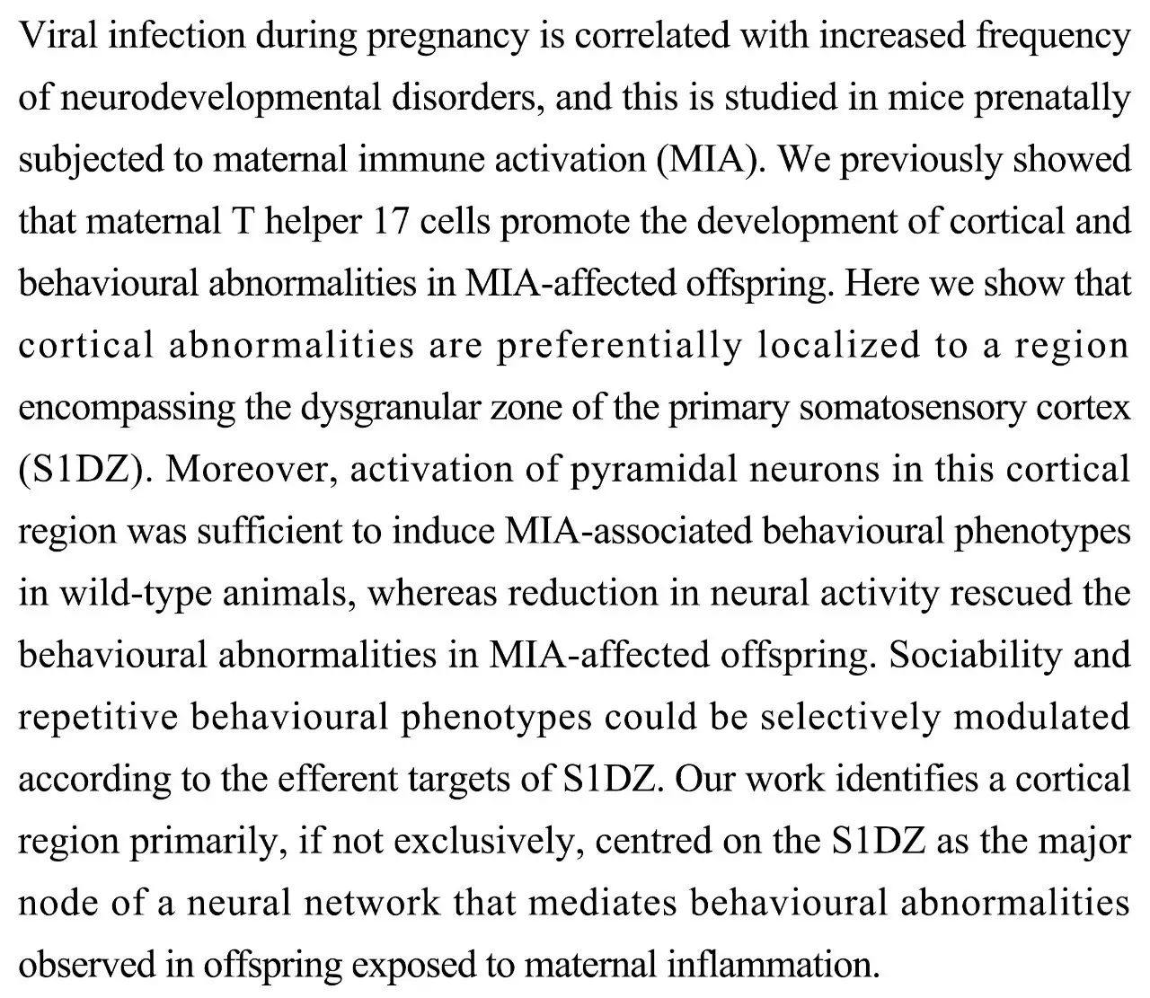 (导读 郭怿暄)孕期病毒感染与神经发育疾病发生频率上升有关。本研究发现在母体免疫激活(MIA)的小鼠后代中出现的皮质异常集中在大脑的异颗粒区初级躯体感觉皮质部位。使正常小鼠该区域锥形神经元兴奋可诱导出现 MIA 相关行为表型,抑制神经活性可改善 MIA 小鼠的后代行为。这一工作首次发现了介导这一行为异常神经网络的主要节点。