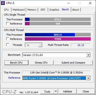 Core i9-11900K 在单核测试中得分为 675.3。在两个跑分结果上,CPU-Z 提供了自己的参考标准,也就是 AMD Zen3 旗舰 Ryzen 9 5950X,它在单核测试中的得分为 648。