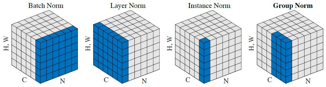 图 2:归一化方法。每个子图展示了一个特征图张量,N 是批坐标轴,C 是通道轴,(H,W)是空间轴。通过计算蓝色像素值的和,这些像素被同样的平均值与方差归一化的。