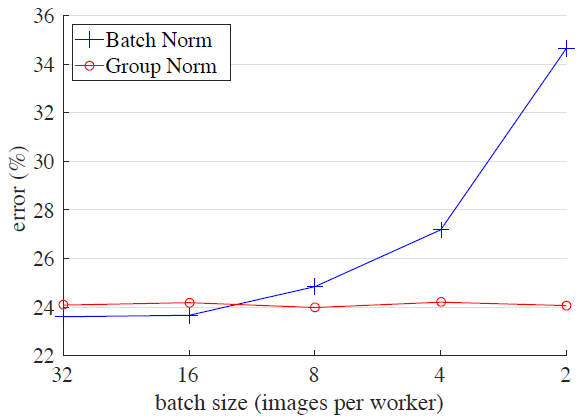 尽管取得了很大的成果,BN 也会因为归一不同批尺寸的独特行为而有缺点。特别是,BN 需要用到足够大的批大小(例如,每个工作站采用 32 的批量大小)。一个小批量会导致估算批统计不准确,减小 BN 的批大小会极大地增加模型错误率(图 1)。结果导致,如今许多模型都使用较大的批训练,它们非常耗费内存。反过来,训练模型时对 BN 效力的极度依赖性阻碍了人们用有限内存探索更高容量的模型。