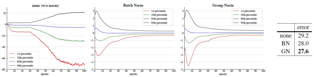 图 6:VGG-16 上 conv5 3 输出(在归一化和 ReLU 之前)的演进特征分布,以 {1, 20, 80, 99} 百分比位置的返回值进行结果展示。右侧表格显示了 ImageNet 验证误差(%)。模型是以 32 张图片/GPU 的吞吐量进行训练的。