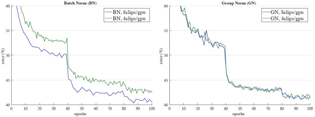 图 7:Kinetics 中,输入长度为 32 帧的误差曲线。FAIR 的研究人员展示了 ResNet-50 I3D 分别应用 BN(左侧)和 GN(右侧)的验证误差率,批量大小为 8 和 4 clips/GPU。实验监控的验证误差率是通过和训练集相同的数据增强得到的 1-clip 误差率。