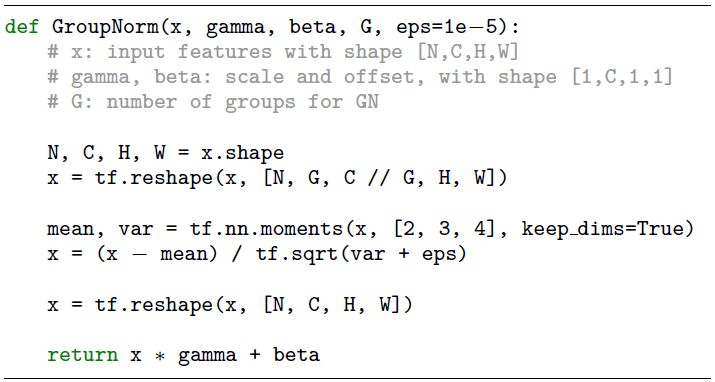 GN 可以通过 PyTorch [41] 和 TensorFlow [1] 中的几行代码轻松实现,二者均支持自动微分。图 3 是基于 TensorFlow 的代码。实际上,我们仅需要指定均值和方差的计算方式,恰当的坐标轴由归一化方法定义。