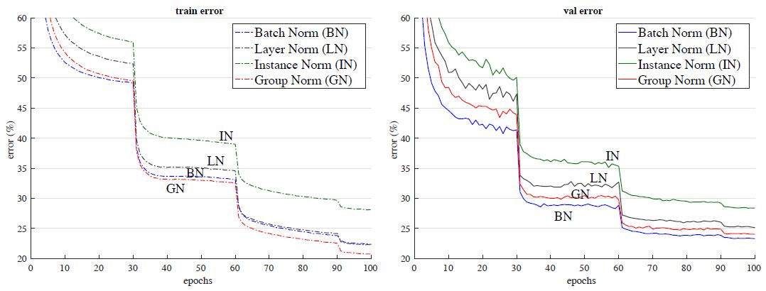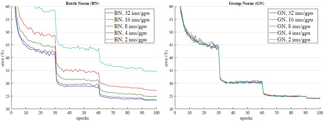 图 5:对批量大小的敏感度:BN(左)和 GN(右)在 ResNet-50 上的验证误差率,训练是以 32、16、8、4 和 2 张图像/GPU 的吞吐量进行的。
