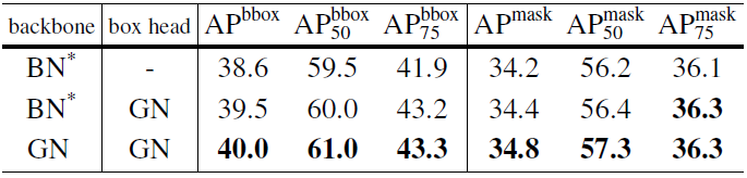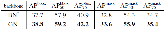 表 5:在 COCO 数据集上的目标检测和分割结果,使用 Mask R-CNN(ResNet-50 FPN 以及 4conv1fc 边框)。BN*表示 BN 被冻结。
