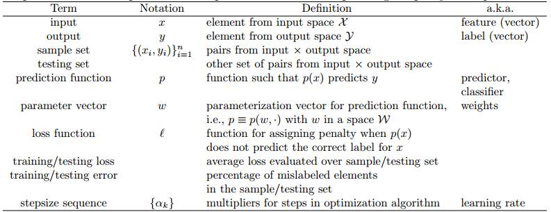 表 1 : 监督机器学习的术语表(监督机器学习的目的之一就是理解输入空间 X 中每个输入向量 x 和输出空间 Y 中相应输出向量 y 之间的关系)