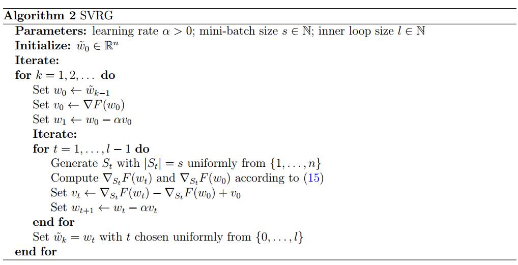 为了方便引用,我们把 SVRG 叫做算法 2。该算法在每个外部迭代中执行一次完整的梯度计算,然后沿着随机方向再迭代 L 步,这是整个梯度的随机修正过程。内环步长 L(inner loop size)必须满足一定的条件以保证收敛 [ 44 ]。