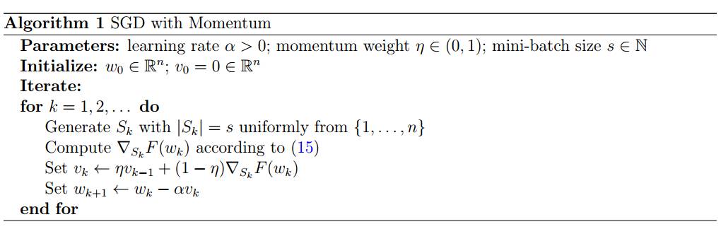 然而,在实际运用中,标准的 SGD 并不一定是解决机器学习中优化问题的最有效方法。事实上,机器学习和优化算法领域在开发改进或替代 SGD 方面进行了大量的积极研究。在随后的两部分中,我们将讨论两类方法:方差缩减法和二阶方法。但是在这两类方法以外,还有多种方法。例如,加有动量的 SGD 就是一个实践中被发现的性能好于好于标准 SGD 的拓展版 SGD。见下图算法 1
