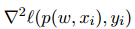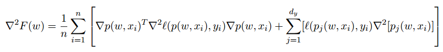 其中是关于第一个参数的损失函数 l(·, ·) 的海塞矩阵,∇p(w, xi) 是 dy-维函数 p(w, x) 对于权重 w 的雅可比式,∇^2 [pj (w, xi)] for all j ∈ {1, . . . , dy} 是关于 w 的按元素运算的海塞矩阵。