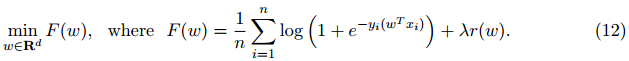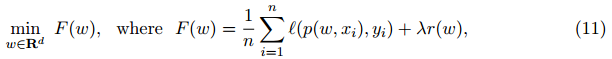 这一类中包含很多机器学习模型,包括支持向量机、Lasso(Least Absolute Shrinkage and Selection Operator)、稀疏逆协方差选择等。有关这些模型的详细信息请参见 [86] 和其中的参考文献。为了每一步都能具体(展现出来),此处我们指定以二分类的正则化logistic回归为例(进行讲解)。为了简化例子中的符号,我们作不失一般性的假设,令。(此处省去了偏置项 b0),这一省略操作可以通过在输入向量上增加一维恒为 1 的特征值来弥补)。当 w 和 x 都是 d 维时就可以令其为特定的凸优化问题。