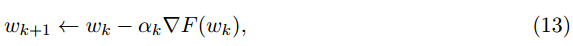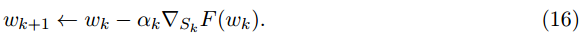 在每一次迭代中,随机梯度法都会计算梯度 F(Wk)的无偏估计 GK。该估计可以以及低的代价计算得到;例如,对于公式(12),某次迭代的随机梯度可被求解为