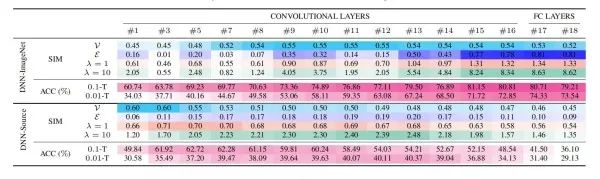 在Syn2Real-C数据集(包含有合成图像的数据域以及真实图像的数据域)上进行层迁移的实验,分别考虑了两种源模型(在合成数据域上训练的模型和在ImageNet[6]上预训练的模型)来进行迁移至真实数据域。在迁移时,只利用了1%(0.01-T)和10%(0.1-T)的标注数据来进行训练,观察迁移效果和深度归因图相似性之间的关系。根据上图中颜色的深浅可知,对于两种不同的源模型,迁移效果越好的层,计算得到的深度归因图相似性越高,迁移效果越差的层,计算得到的深度归因图相似性也越低,验证了论文中方法的准确性。