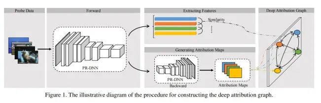 在该定义下,预训练模型的选择和模型微调时临界点的选择实际上是该迁移性定义下的两个特例。然后,这篇论文提出了深度归因图谱(DEeP Attribution gRAph, DEPARA)来表示在预训练深度模型中学习到的知识。在深度归因图谱中,节点对应于输入,并由模型在输入数据上归因形成的归因图[2]来表达。边表示输入数据之间的关联,通过它们在预训练深度模型特征空间中的相似度来度量,如图1所示。