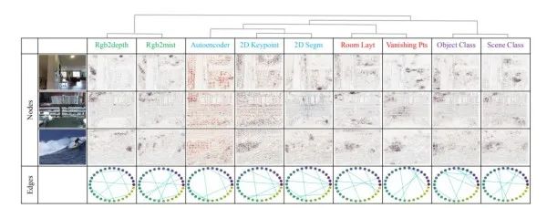 事实上,在任务分类法中,Rgb2depth和Rgb2mist彼此间具有很高的迁移性,但它们到自编码器的迁移性相对较低。此外,任务分类法采用层次聚类的方式把任务划分为四组:2D任务(蓝色),3D任务(绿色),几何任务(红色)以及语义任务(品红色)。图中选取了2个3D任务,3个2D任务,2个几何任务以及2个语义任务作可视化。任务分类法在这些任务上生成的任务相似树绘制在任务名称的上方。从图可以看出,在每个任务组内部,深度归因图谱生成较为相似的节点以及边。